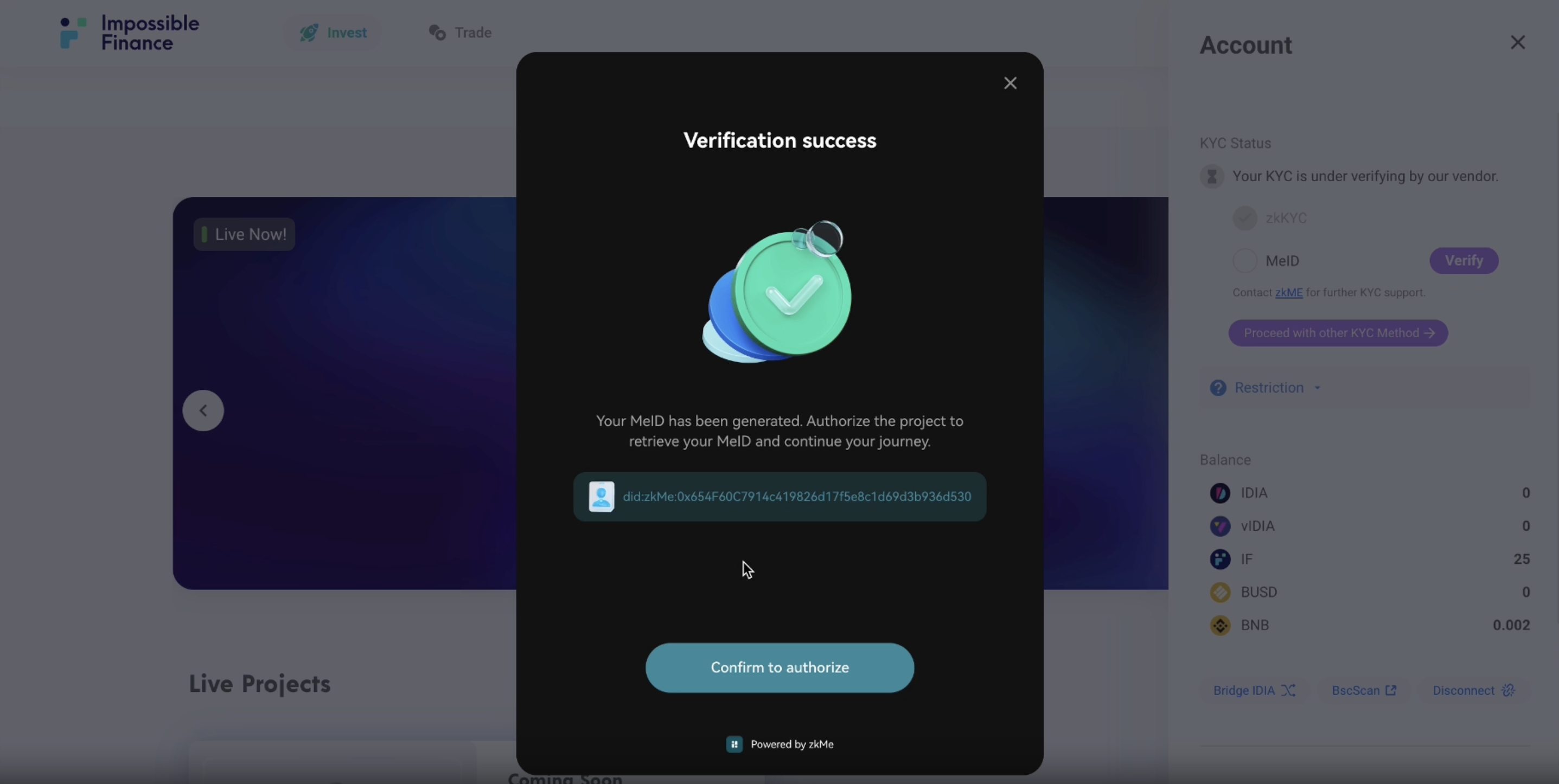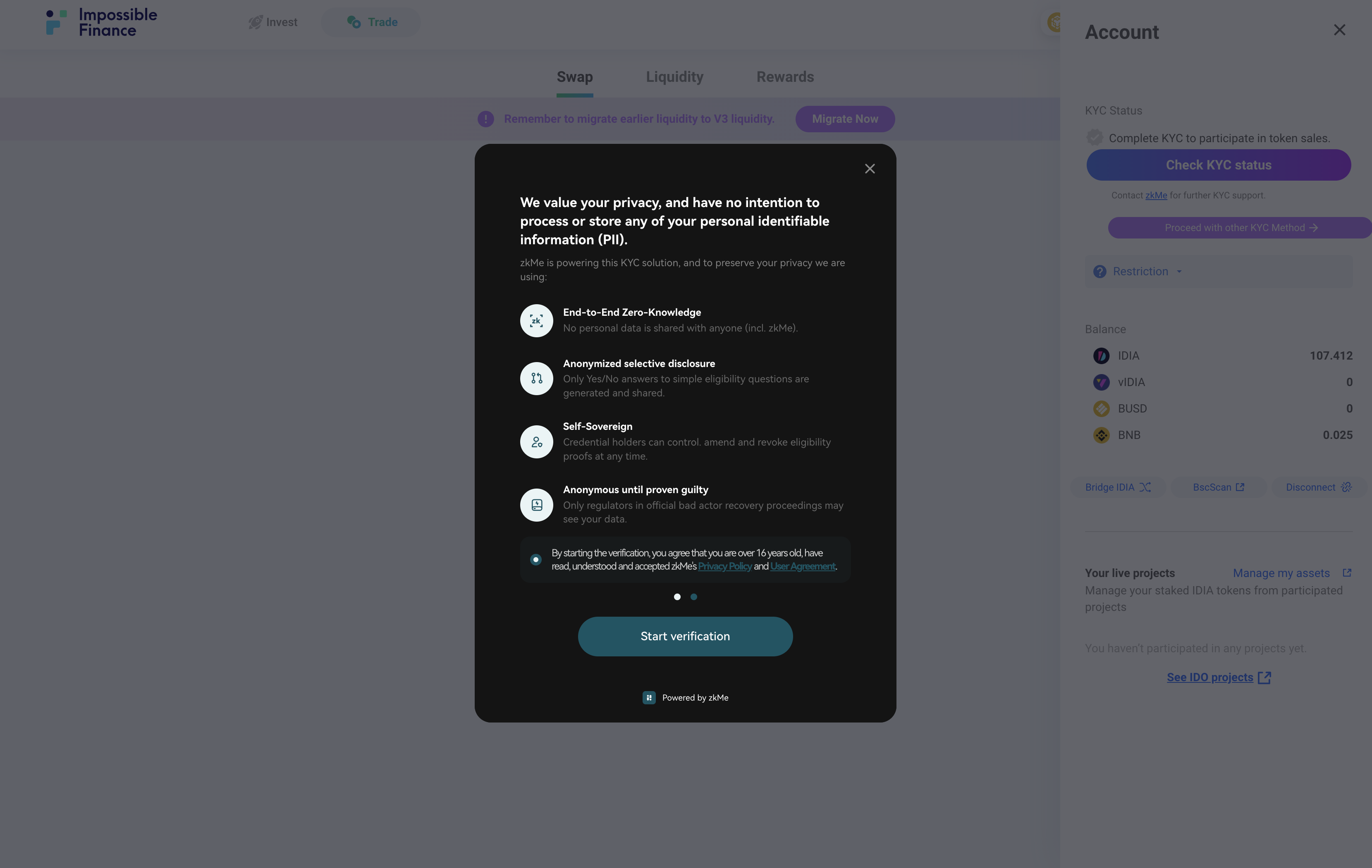 Please note that you need to hold at least 15 IDIA to start KYC on the Impossible Launchpad. \